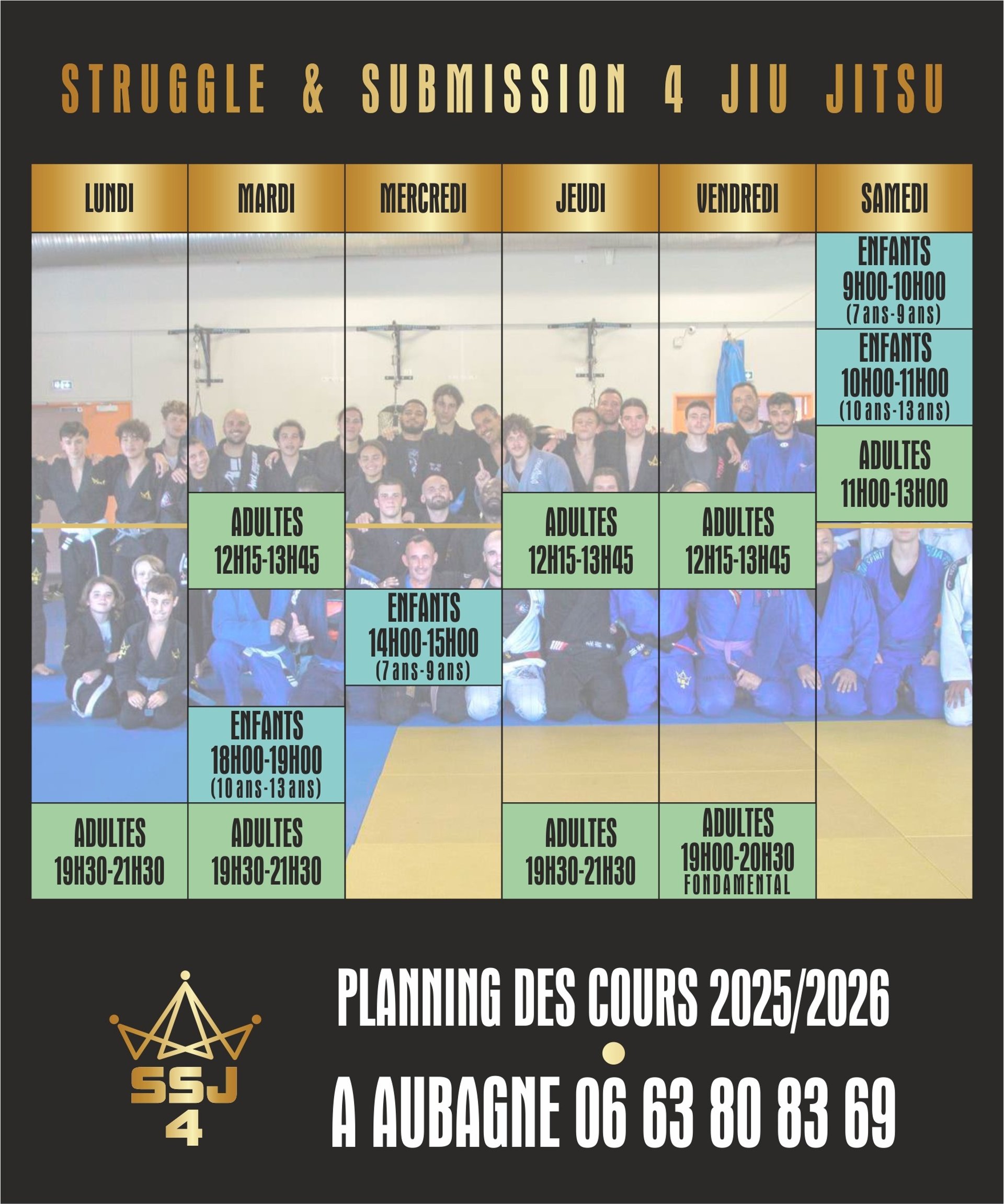 9 cours adultes ( JJB et grappling ), 2 cours de jiu-jitsu brésilien dédies aux ados ( 10 / 14ans ) et 2 aux enfants ( 7 / 9ans )